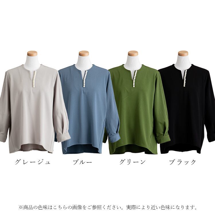 上品パール付きキーネックブラウス プルオーバー チュニック パール 装飾 フェミニン スキッパー