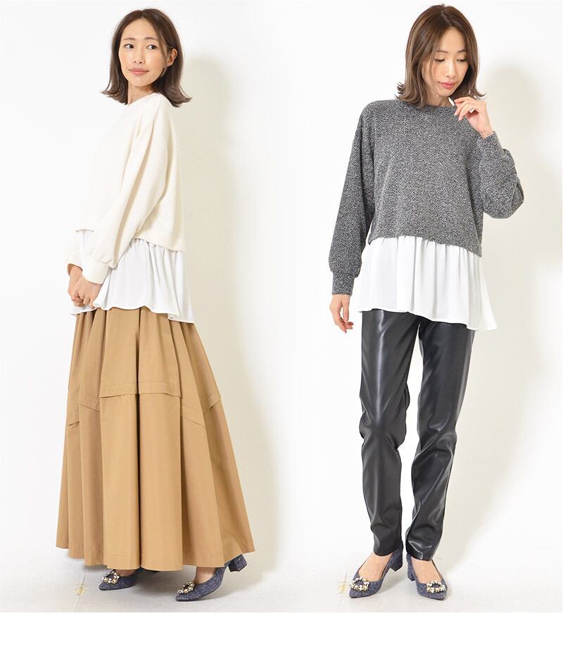 異素材の組み合わせがレイヤード風に見えるので、こなれ感たっぷりのコーディネートに。