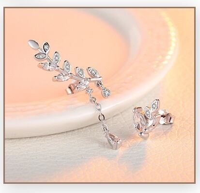 小粒 CZ リーフ デザイン スタッド ピアス 大小ペア キャッチ 付 S925 シルバー/イヤーカフ 風/大(右耳用) + 小(両耳兼用) セット