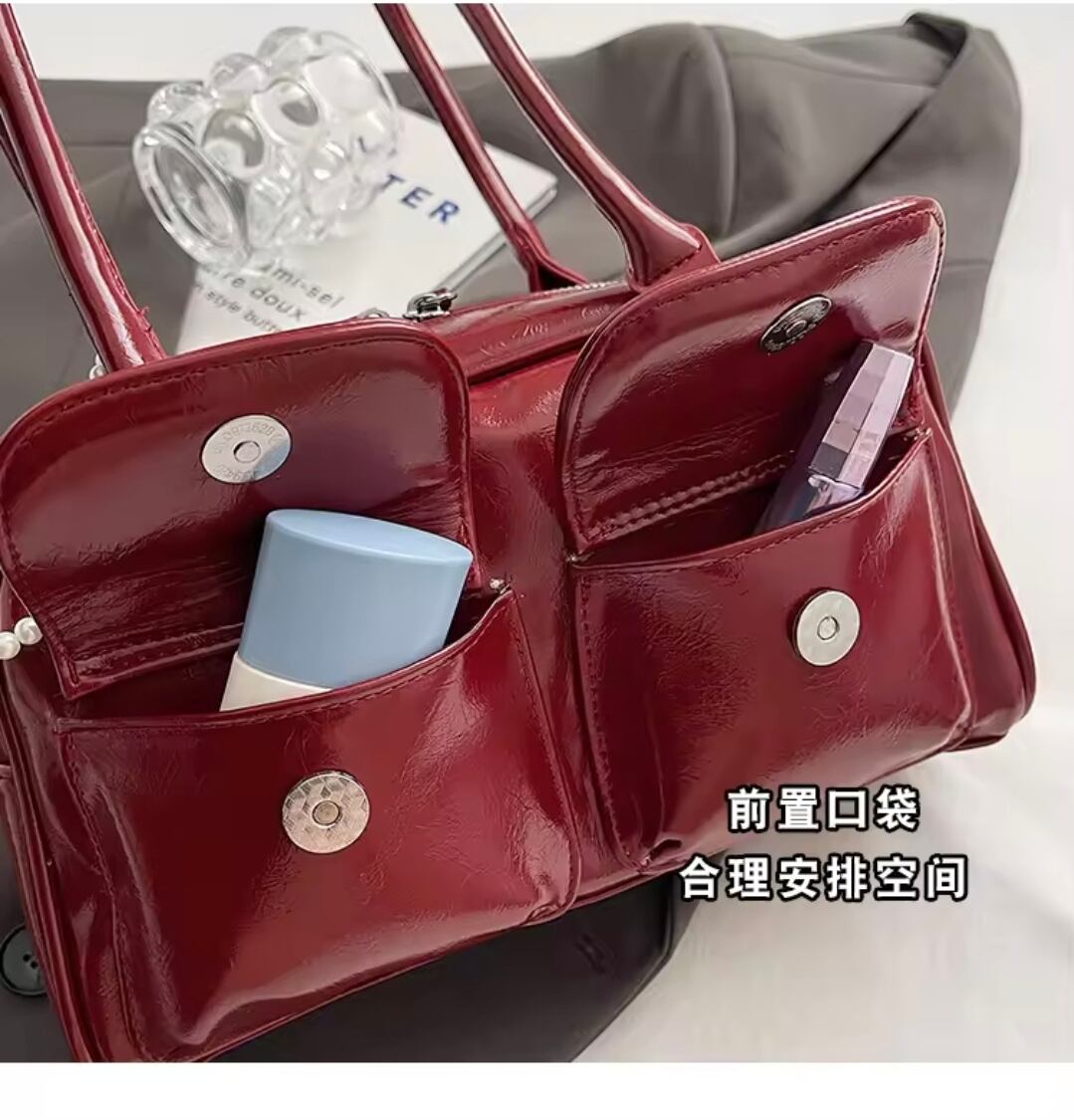 韓国スタイルのおしゃれなショルダーバッグ、ボストン型のボウリングハンドバッグ、多ポケットで大容量のショルダーバッグ 赤