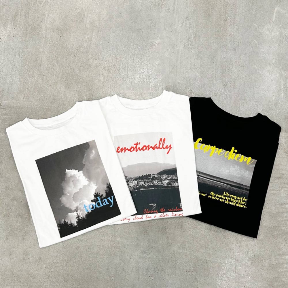 胸元に入ったカラーロゴがこなれ感を演出し、フォトプリントとの組み合わせでスタイリッシュな雰囲気に。