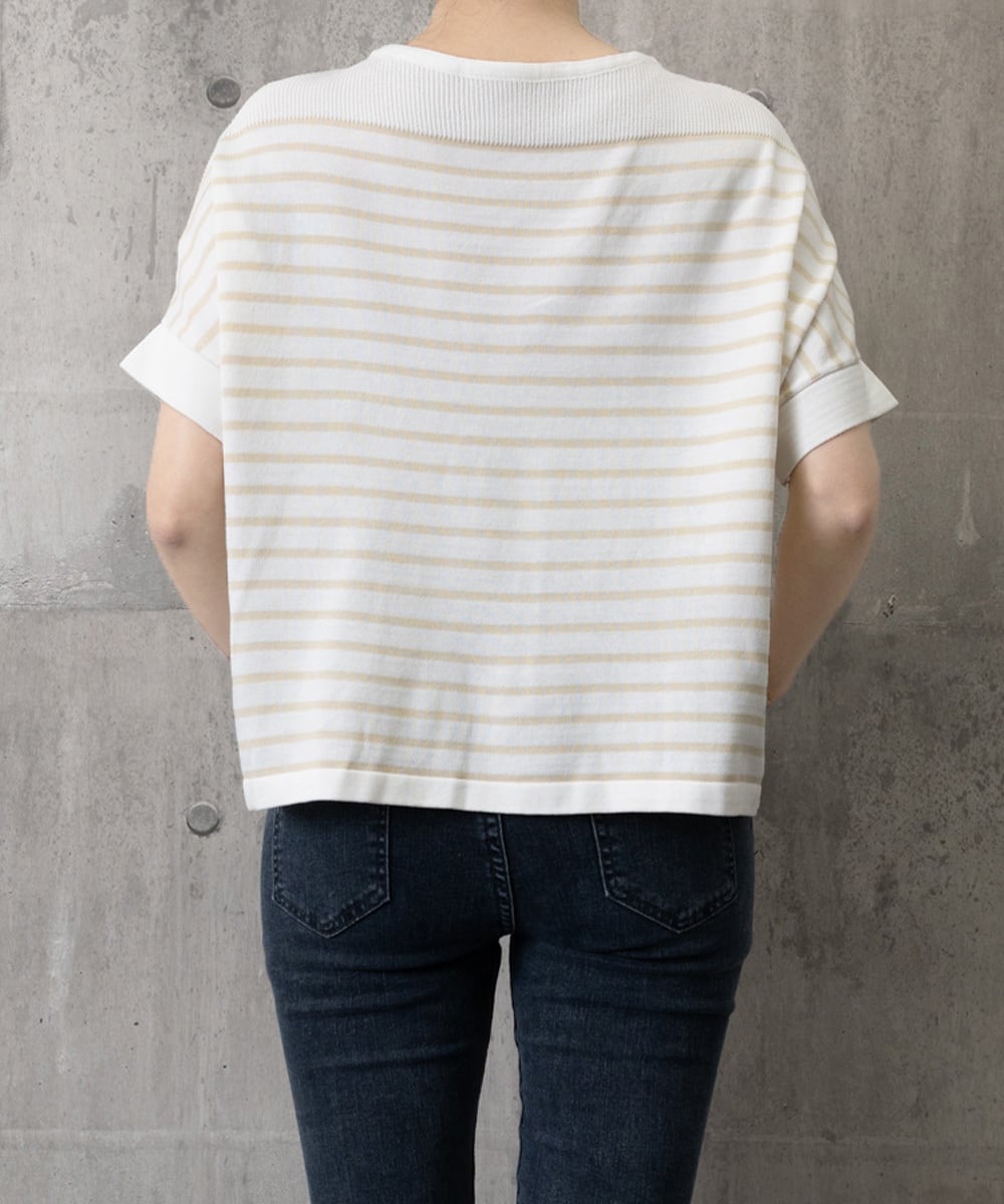 【日本倉庫即納】着やせ 体型カバー ボーダー柄サマーニット 《ドルマンスリ ーブ×ゆったりシルエット》オフホワイト