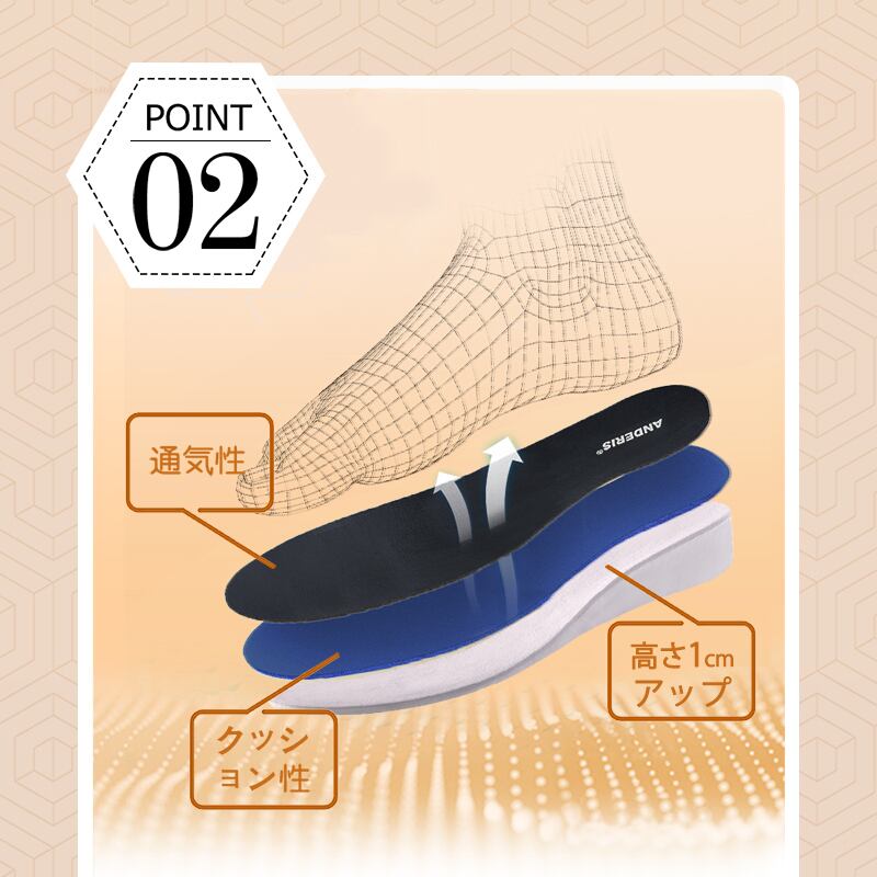 約3cmの厚めエアソールが、着地の衝撃を分散。膝や腰への負担を軽減し、毎日の歩行をサポート。