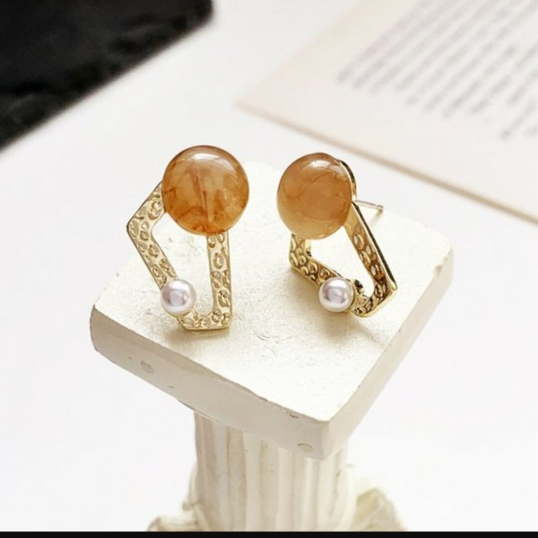 不規則な四角形フレームにブラウンビーズとパールをあしらったピアス。落ち着いたクラシカルな雰囲気が大人モードな装いに。小ぶりなサイズ感で、ちょっとしたアクセントにピッタリです。