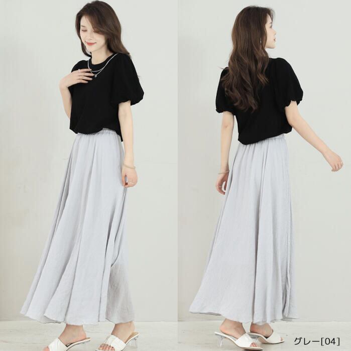 たっぷりと分量を取ったふんわりシルエットのボリュームフレアロングスカート。