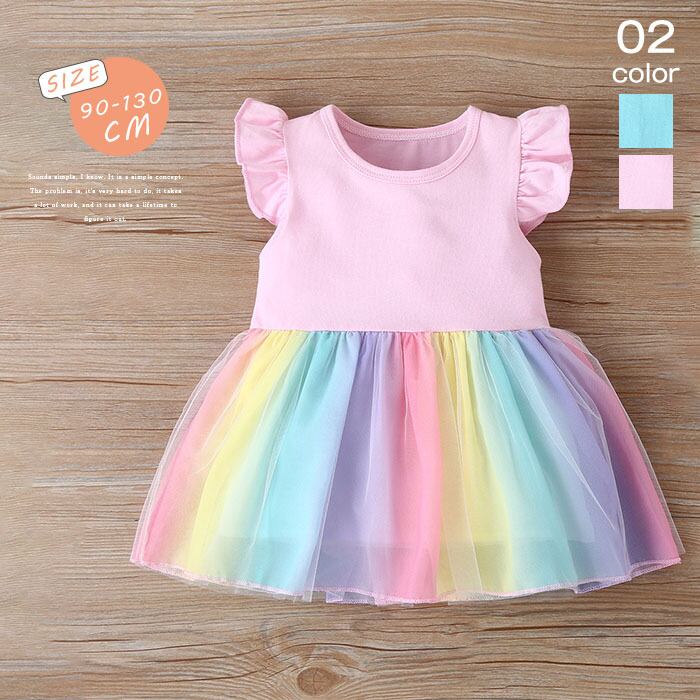 キッズ ワンピース チュール 子供 ノースリーブ 夏 チュールワンピ 袖フリル 女の子 クルーネック 虹 レインボー フレア ワンピ 子ども 女児 夏服 プリンセス 子供服 ジュニア ガールズ かわい