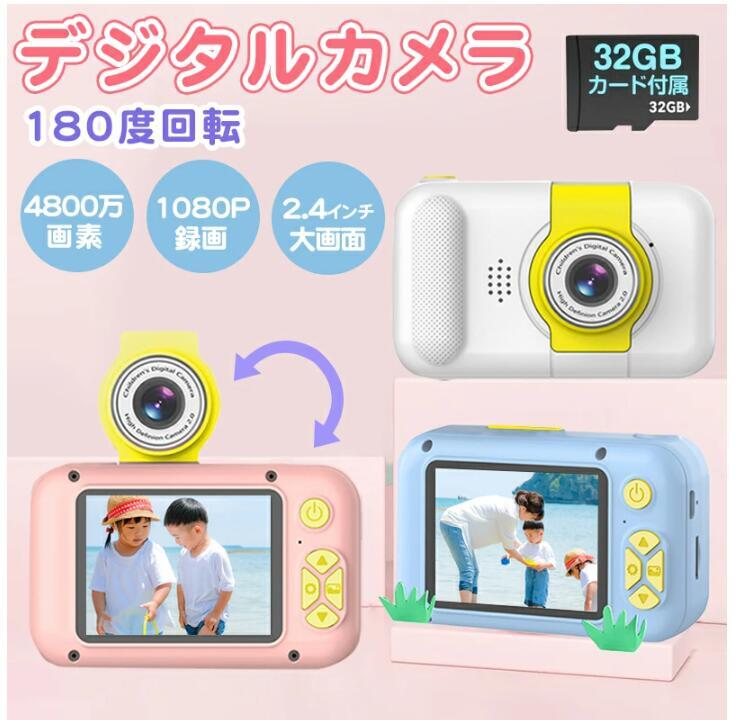子供用カメラ キッズカメラ レンズ180°反転可能 2.4インチIPS画面 2022 4000万画素 1080P HD録画 ゲーム 音楽 4倍ズーム トイカメラ USB充電 32GB カード付き 子供の日 誕生日 プレゼント 日本語説明書 (blue)