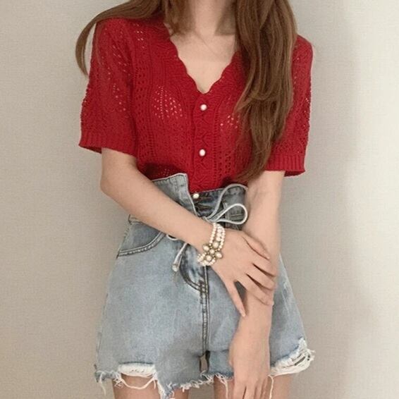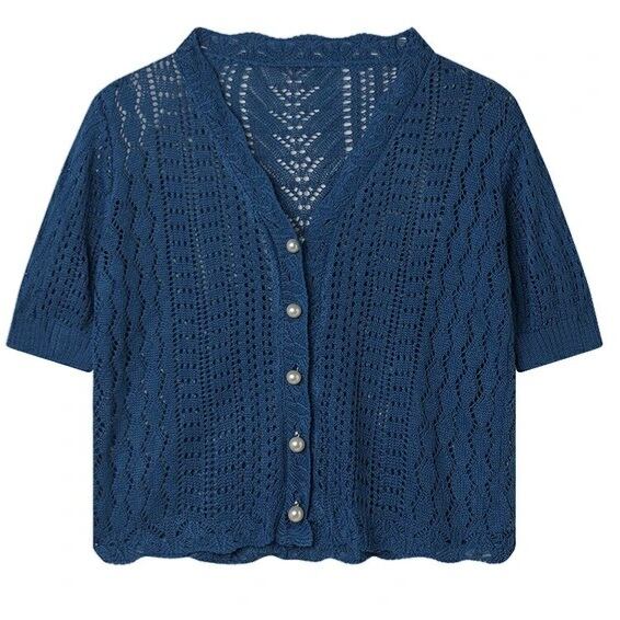 【予約販売☆】レディース 半袖カギ編みニット Vネックカーディガン クロシェニットトップス