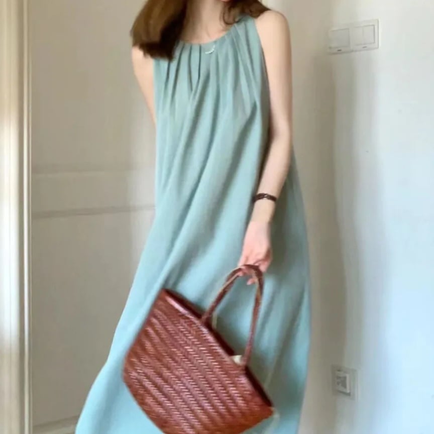 超人気綿麻素材心地よいシンプルフェミニンノースリーブミモレ丈ワンピース