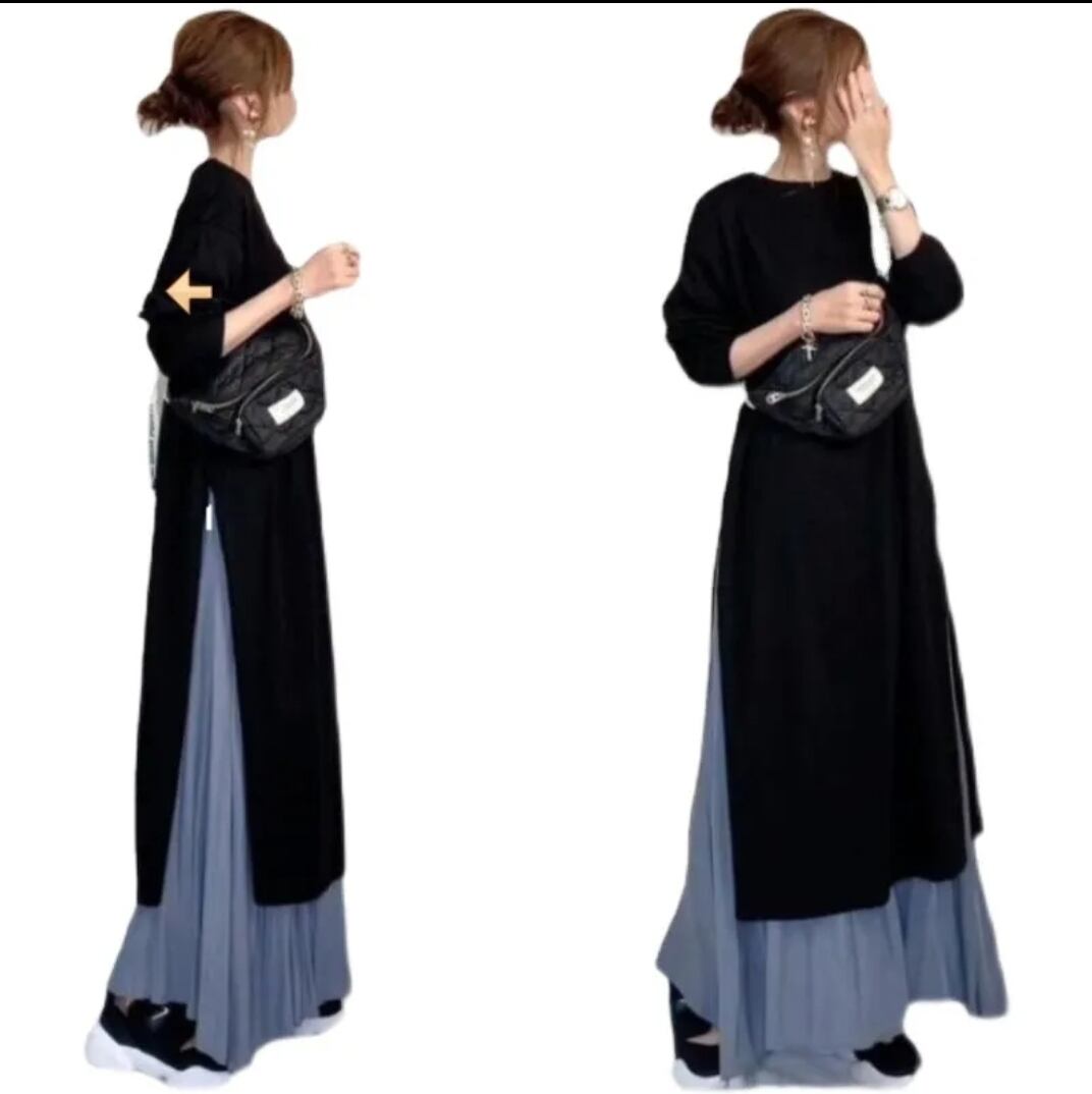 ロングワンピース スカート セット 重ね着 細見え 春 秋 普段使い お出かけ デート 黒 ブルー パープル グリーン アプリコット ラウンドネック 大きめ 無地 大人 清楚 可愛い 上品 個性的 ゆったり Aライン スリット 長袖 ミモレ丈 人気 トレンド 10代 20代 30代