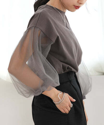 オーガンジーとカットソーの異素材切替デザインがポイントの主役級デザイントップス。ふんわりと広がるボリューム袖が女性らしさとトレンド感を演出してくれる1枚です!