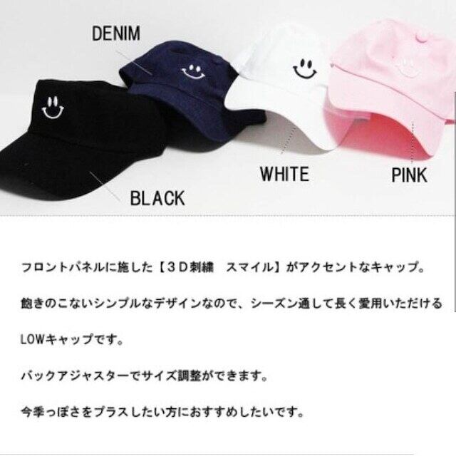 フロントパネルに施した【3D刺繍 スマイル】がアクセントなキャップ。