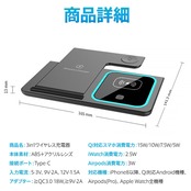 本体素材:ABS+アクリルレンズ接続ポート:Type-C入力電流:5-3V、9V-2A、12V-1.5Aアダプター:=>QC3.0 18W、=>9V-2AQi対応スマホ消費電力:15W/10W/7.5W/5WiWatch消費電力:2.5WAirpods消費電力:3W対応機種:iPhone8以降、Qi対応Android機種、Airpods(Pro)、Apple Watch全機種