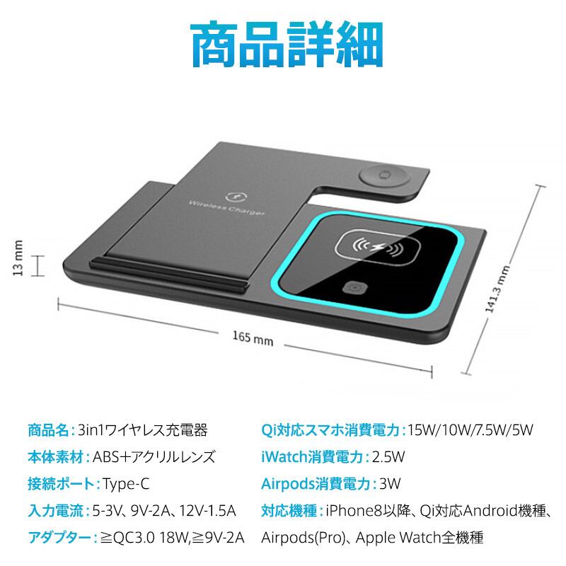 ワイヤレス 充電器 ブルーライト搭載 Airpods Pro Apple Watch Andriod 3in1 Qi ワイヤレスチャージャー