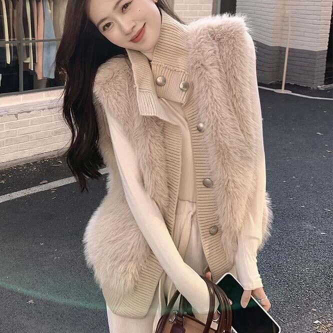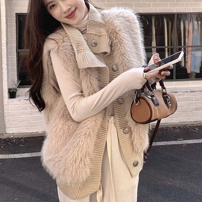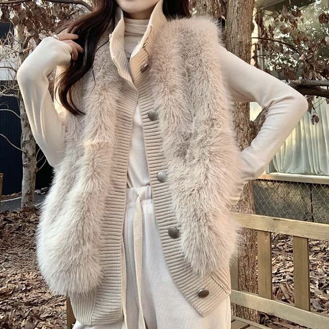 ファーベスト レディース ニットベスト 袖なし ジレ 秋冬 フェイクファー ベスト ファーコート ジャケット アウター 着回し 体型カバー レイヤード 重ね着風 チュニック丈 ミドル丈 厚手 ふわふわ エコファー 暖かい 通勤 オフィス OL カジュアル シンプル 無地 おしゃれ