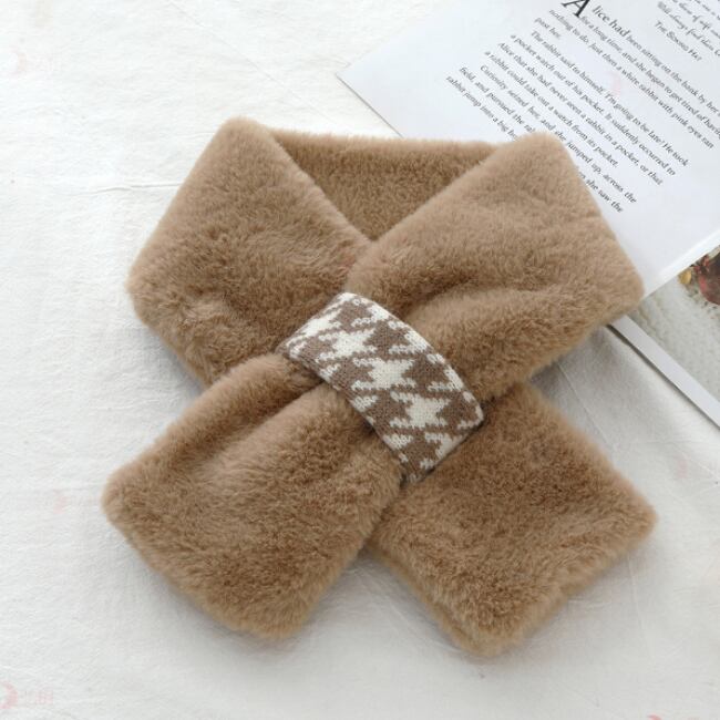 ティペット ラベル飾り クマ ベア付き チェック柄 レディース フェイクファー マフラー ネックウォーマー ファースヌード 差し込み 秋冬用 光沢感 ふわふわ 付け襟 厚い 大人 クリスマス ホワイト ピンク カーキ
