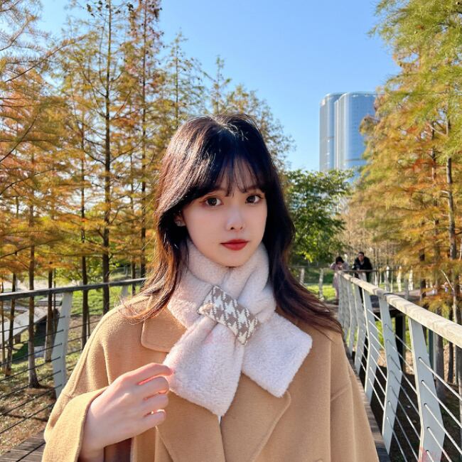 【生地】100%ポリエステル(ふわふわフェイクファーで軽くて暖かいです)、ちくちくせず柔らかい心地いい肌触りもポイント。お首まわりをしっかり覆って隙間ができにくく、 風ではだけてしまうこともないので防寒対策にバッチリ!