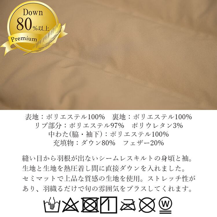 ◆充填物にダウン80%、フェザー20%を使用。 ダウン(羽毛)は吸湿発散性に優れていて、軽くてたっぷりの空気を含んでいます。着ている人の体温を逃がさず、冷たい外気を遮断する効果があります。