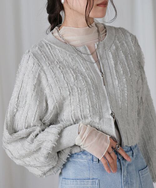 表面感のあるストライプ状のフリンジが華やかな主役級のライトなカーディガンです。可愛らしいぽわん袖から長めの袖リブで華奢な印象を与え、トレンドのクロップド丈はスッキリした見た目と脚長効果が期待できます。ダブルジップをお好みの位置で止めて頂き、シルエットを変えることで着まわしの幅が広がります。様々なコーディネートになじむ優しい色合いの3色展開です。