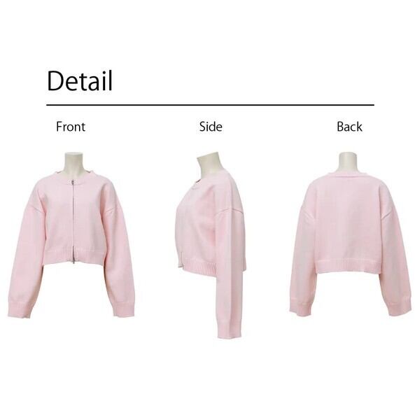 顔周りをスッキリ見せるクルーネックにWジップアップのデザインにすることで、甘めになりすぎない大人な印象に仕上げました。