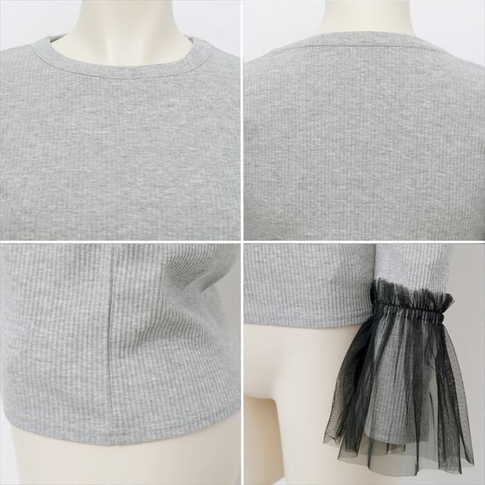 トップス カットソー レディース リブ ベルスリーブ チュール インナー ロンt 長袖 Tシャツ レイヤード風 レース 重ね着 春 夏 シンプル 無地 チュールフレアスリーブリブトップス グレー
