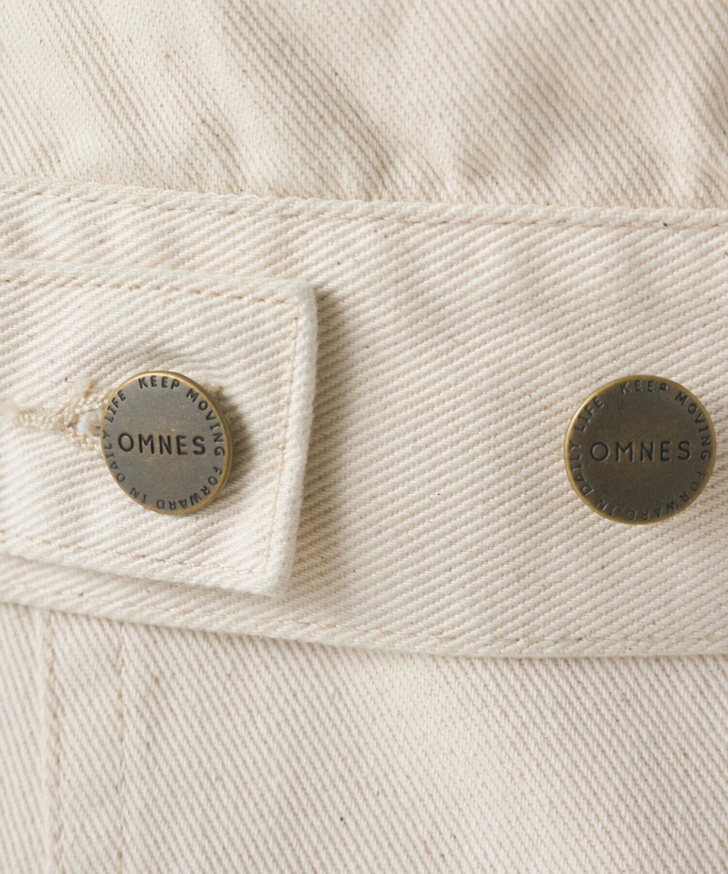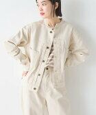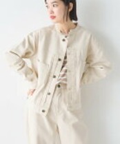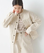 すっきりとした襟元が女性らしいノーカラータイプのデニムジャケット。