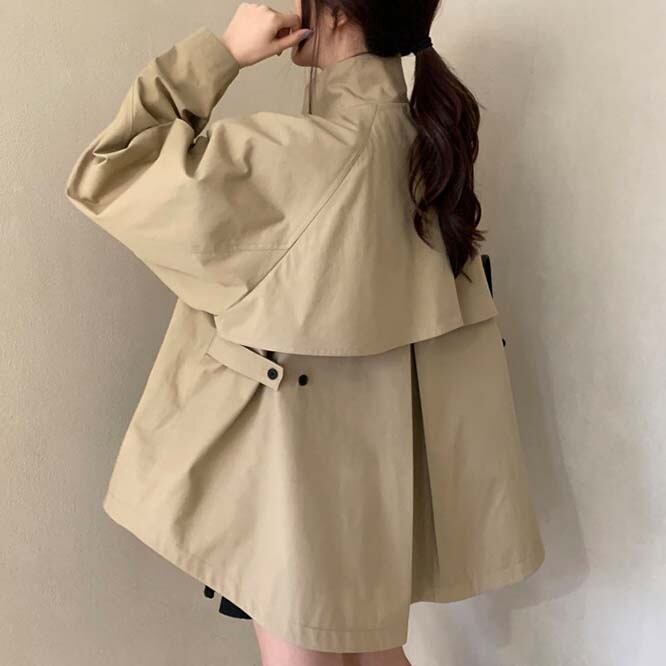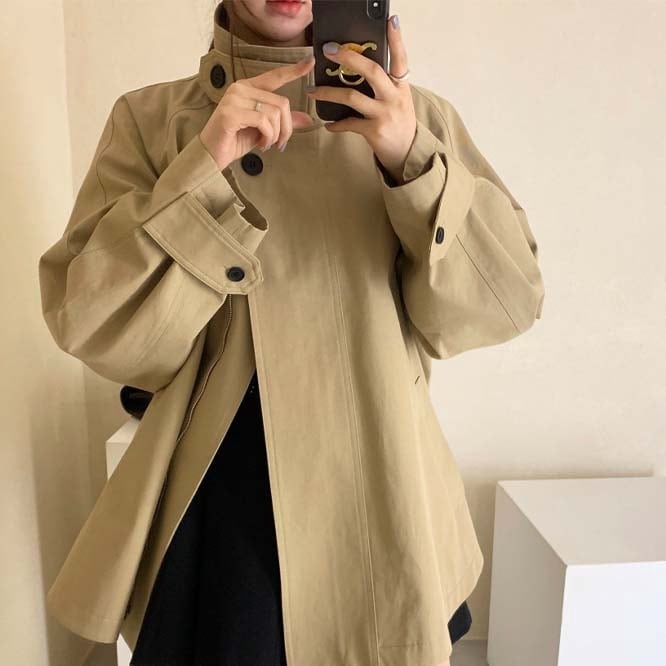 "ワンボタン バックケープ スタンドカラー アウター"は、おしゃれで可愛い上品なアウターです。シンプルなデザインにワンボタンとバックケープがアクセントになっていて、どんなスタイルにもマッチします。春、秋、冬など季節を問わず着用できるので、1枚あると便利なアイテムです。