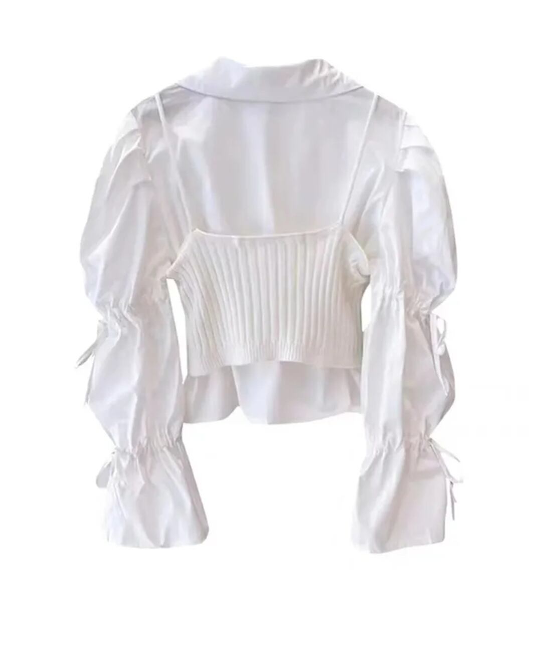 お袖のリボンとシルエットがアクセントのブラウスに、ニットをレイヤード出来るセットアイテム。