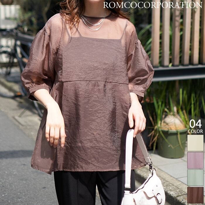 ブラウス レディース ボリューム袖 ペプラム シアー素材 透け感 オーガンジー オーバーシャツ 7分袖 抜き襟 無地 春 夏 韓国 ソフトオーガンジーティアードチュニックブラウス