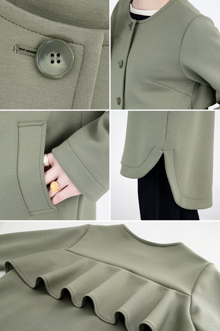 ■ポケットあり ・裏地なし ・肩パットなし ・前中心釦4ヵ所留め ・両脇裾ラウンドスリット ・着丈前後差約11cm