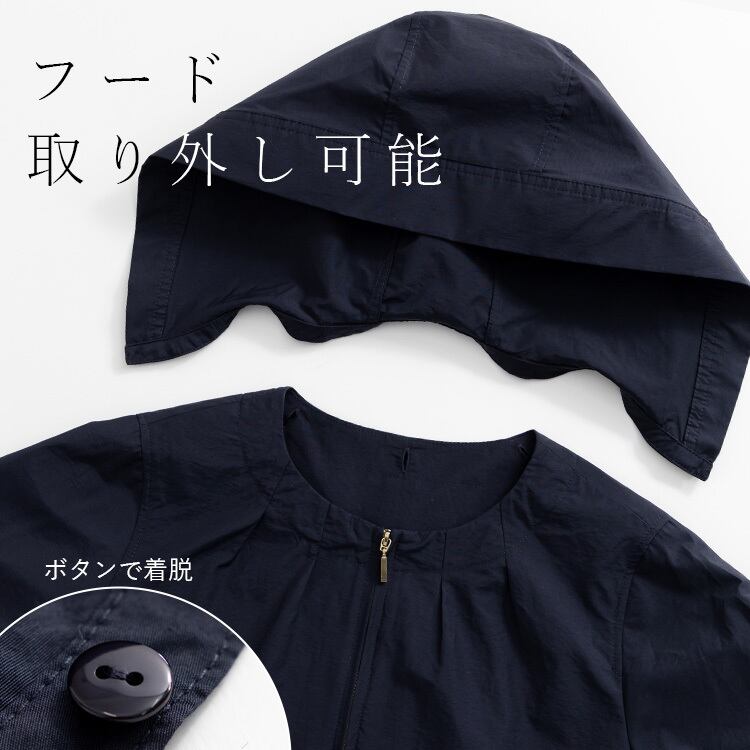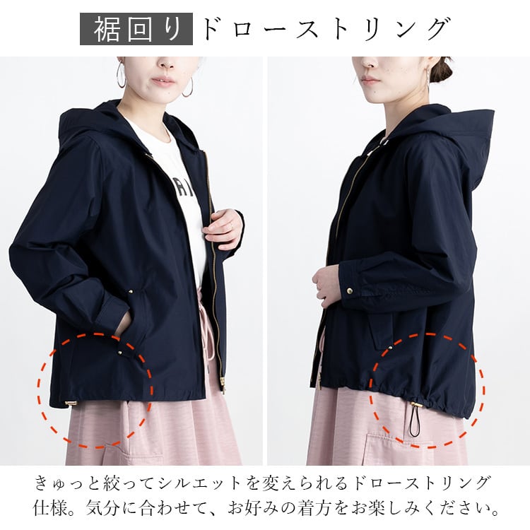 ■裏地なし ・ポケットあり(ポケット口フラップあり) ・前中心ファスナーあき ・フードあり(取り外し可) ・袖口ドット釦1ヶ所留め ・裾ドロスト仕様(ストッパー付き) ・着丈前後差約6cm