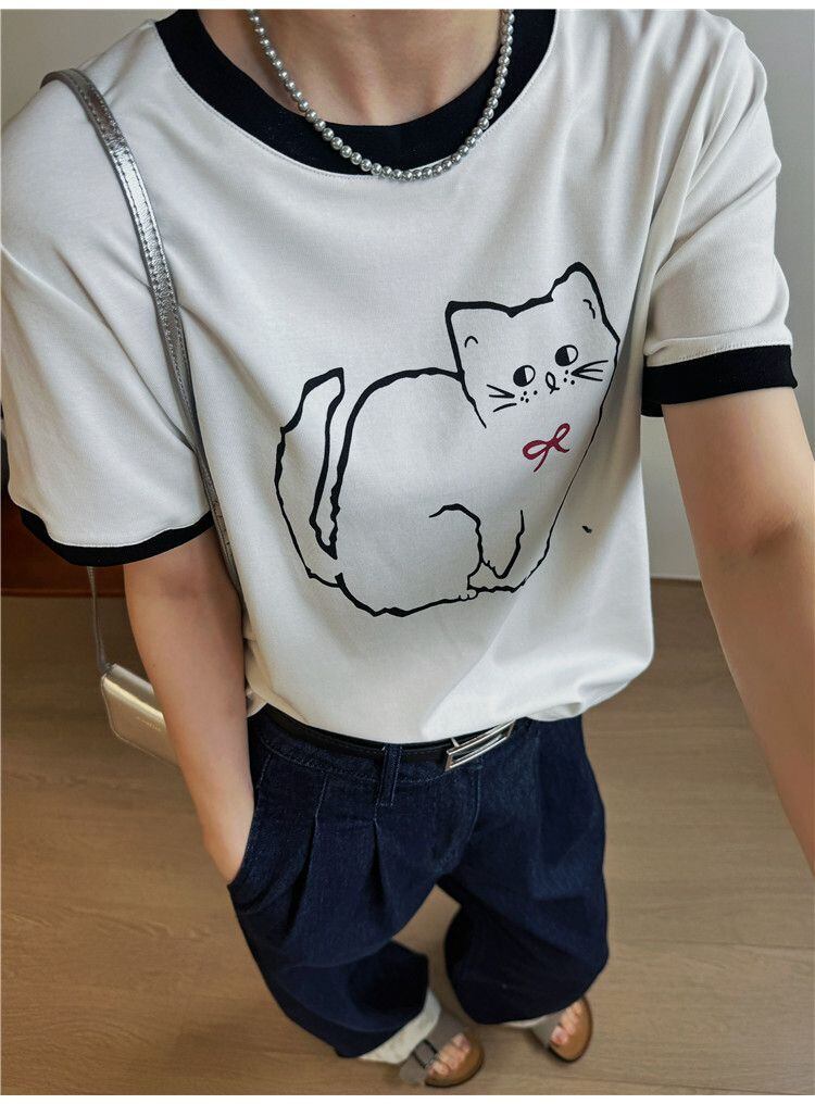 漫画猫プリント半袖 2024 新しい白 Tシャツ韓国風ルーズトップ