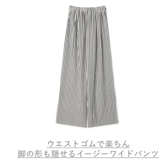 ゆるっと大人のこなれ感。 ストライプワイドパンツ。 軽い着心地で接触冷感素材の ひんやり涼感の肌触りで夏快適! ラインを拾わず体型カバーもできウエストゴムの楽な履き心地に◎ ナチュラルな風合いのストライプが 大人リラクシーな雰囲気に。 両サイドにポケット付きで便利◎ シンプルなTシャツコーデも サマ見え間違いなし◎