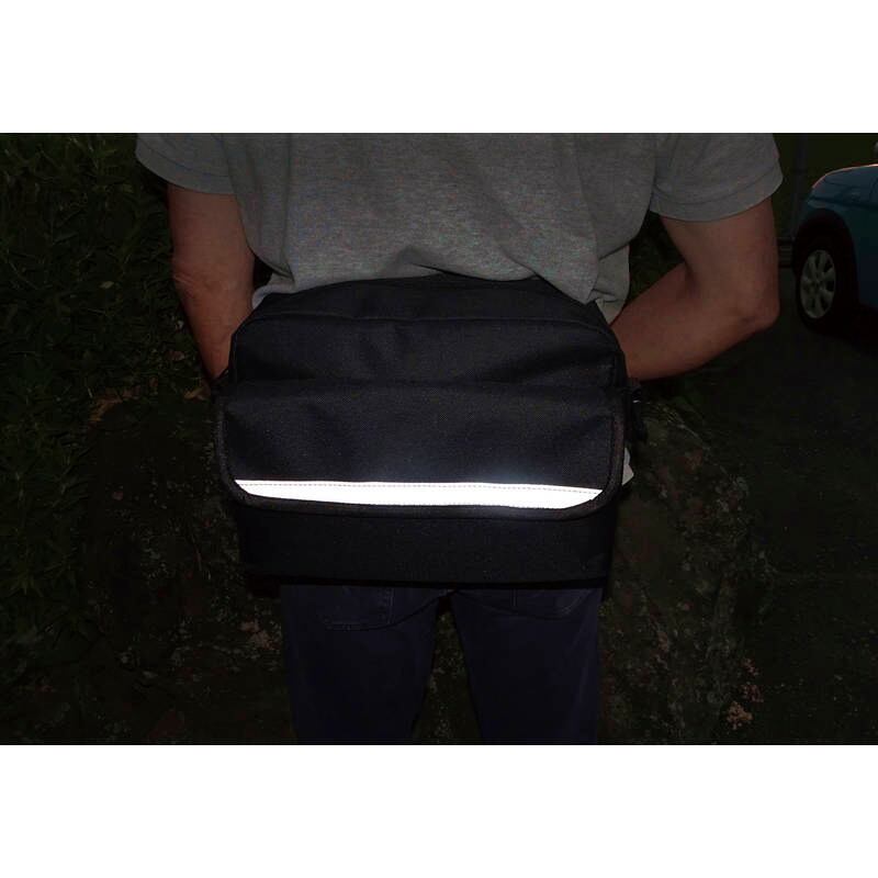 暗い所でライトがまっすぐに当たると反射します。ショルダーとウエストの2WAY仕様収納バッグ付き防災セット