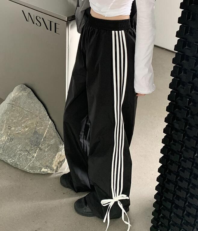 おしゃれで快適なリボントラックパンツが新登場!トレンド感あふれるリボンディテールがアクセントになり、シンプルながらも存在感のあるスタイルを演出します。スポーティなデザインでありながら、カジュアルシーンからちょっとしたお出かけまで幅広く活用できるアイテムです!