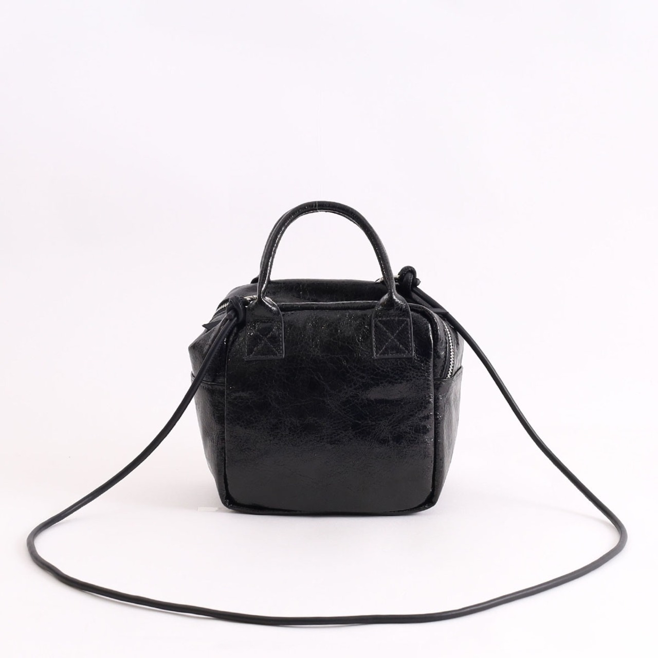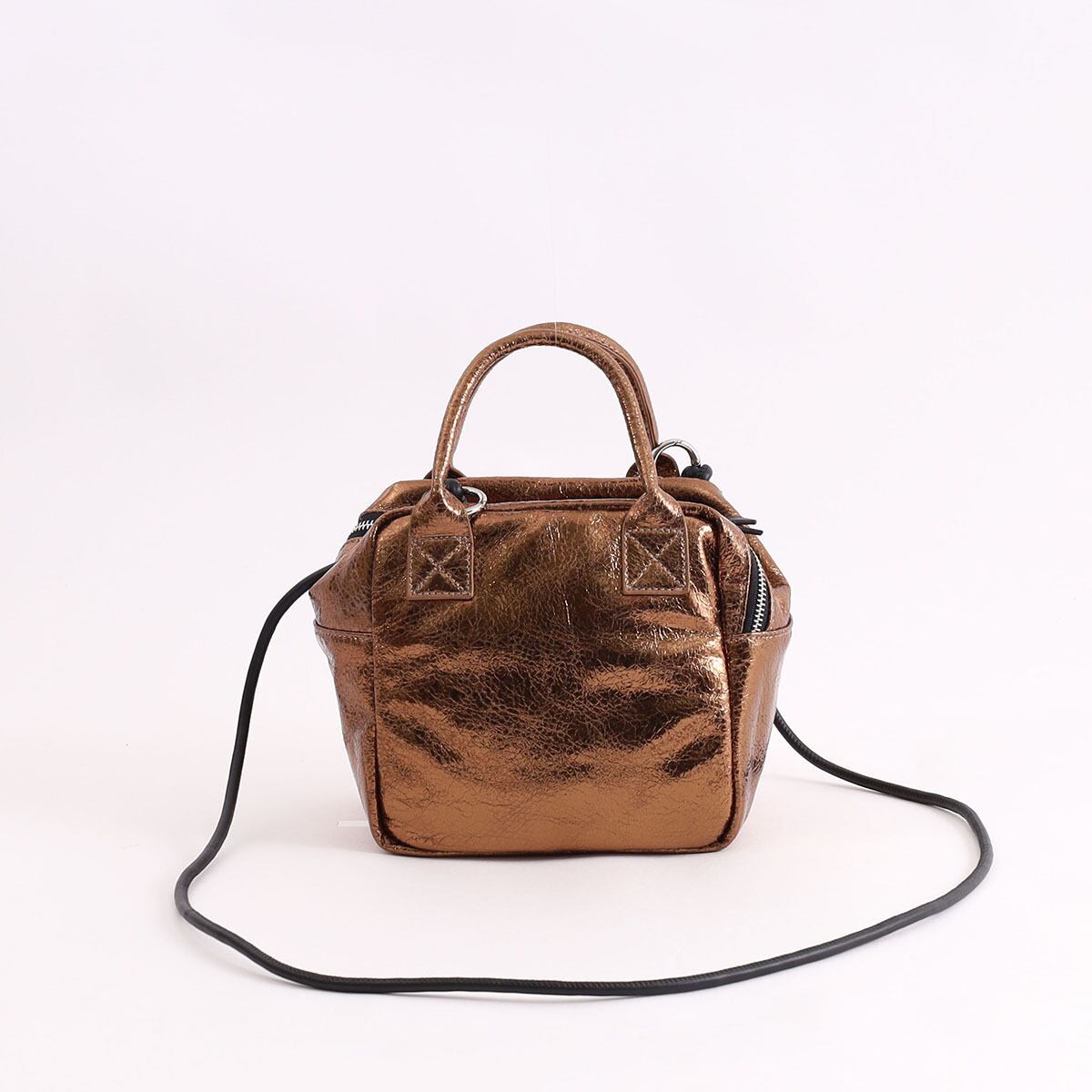 スタイリッシュなメタリックカラーが目を惹くフェイクレザーキューブ型トート。