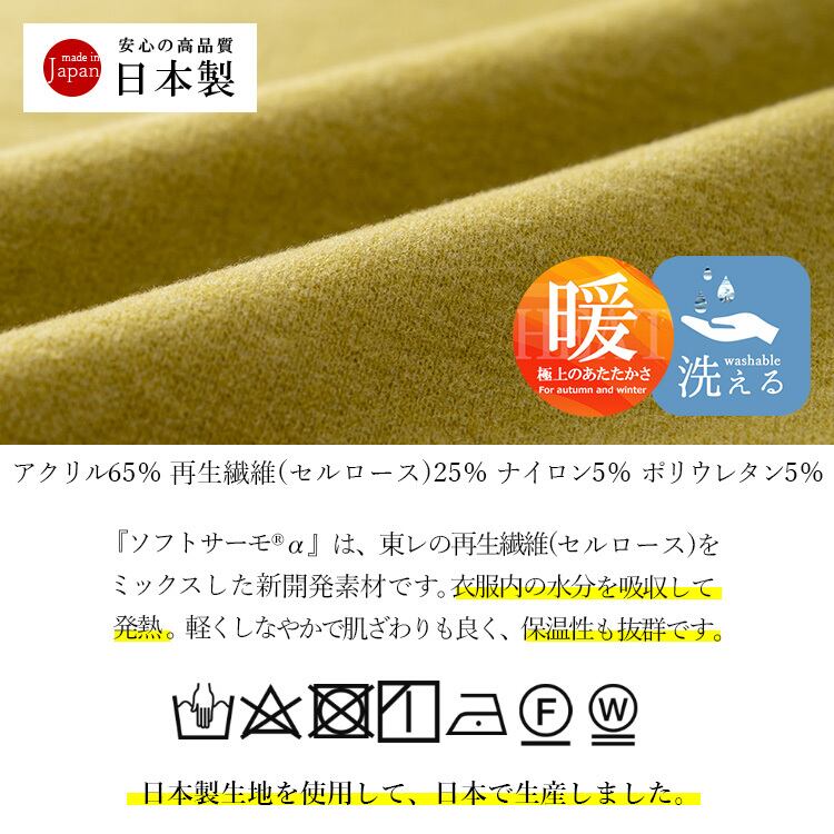 衣服内の水分を吸収して発熱。とてもソフトでしなやかな肌触りで、軽くてあたたかく優れた保温性が特長です。 ご家庭で手洗いができるので、ディリーに幅広く活躍します。 安心の品質、日本製素材せす。
