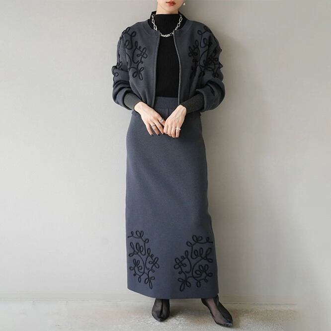 美しい刺繍が施されたセットアップは、合わせやすいデザインで、個々にも活用出来スカートは動きやすく、洗練されたシルエットを描きます。特に女性らしさを引き立てるアイテムであり、特別な日にもデイリー使いにも最適です。