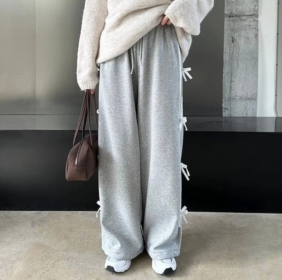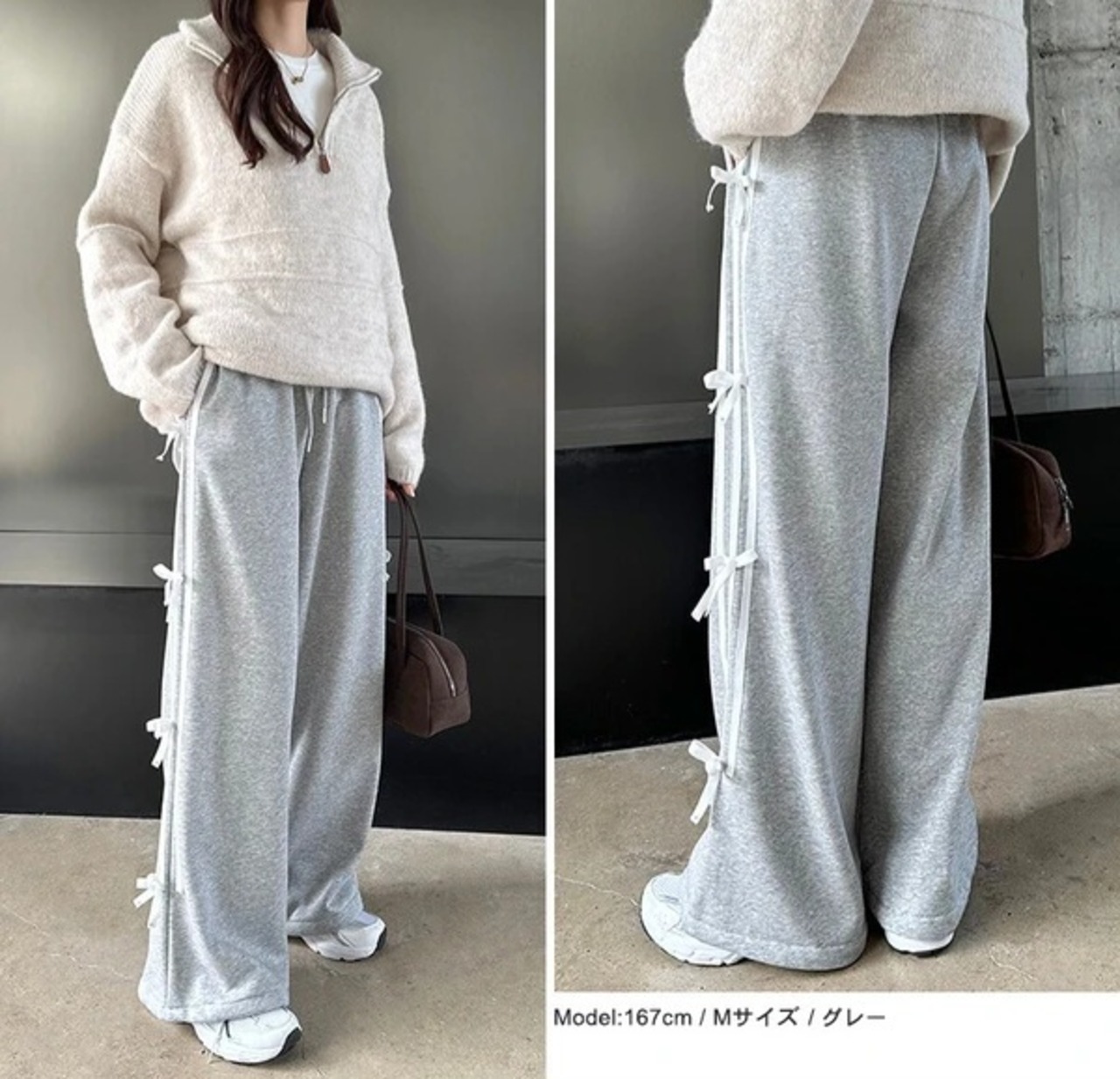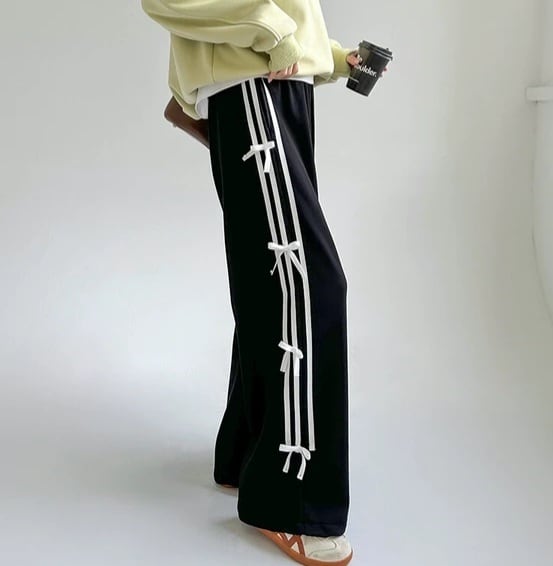 予約販売(出荷予定:2025年1月下旬)裏起毛 ラインパンツ リボン付き ワイドパンツ リボン トラックパンツ レディース あたたか スウェット サイドライン パンツ ボトムス ウエストゴム ストレートパンツ 暖か スウェットパンツ 裏起毛パンツ ライン入り 秋冬 秋 冬 cocomomo