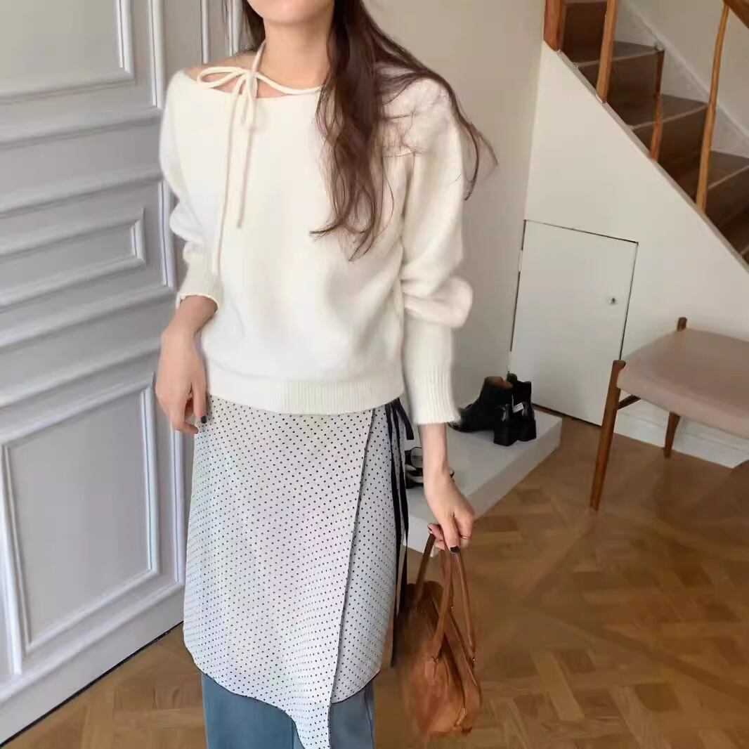 華やかさと可愛さを兼ね備えたオフショルダーリボンニットプルオーバー!このレディースニットトップスは、特に韓国ファッションを愛する方にぴったり。リボンデザインが愛らしさを引き立て、バレエコアスタイルにもマッチします。普段使いはもちろん、特別な日のコーディネートにも最適です。
