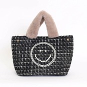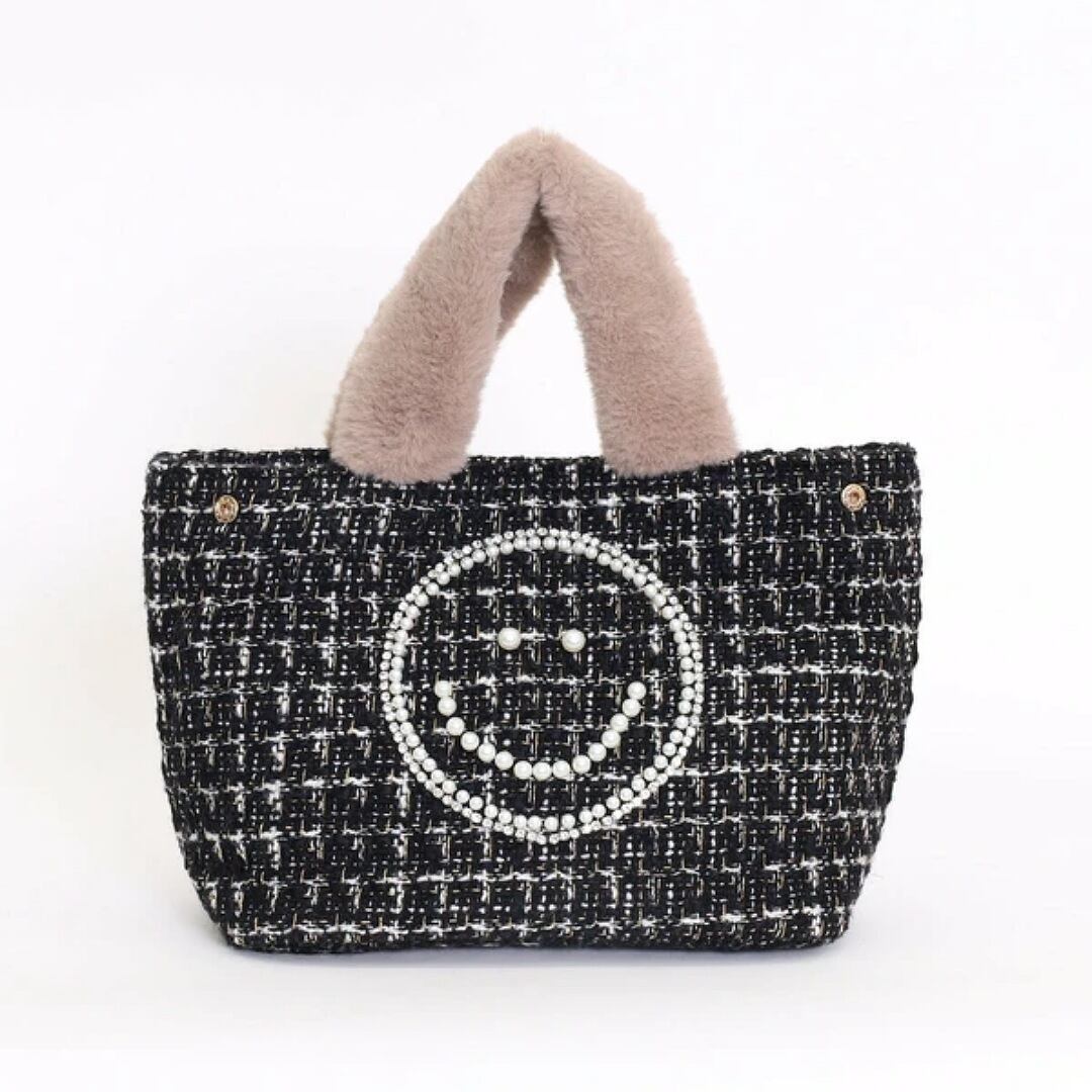 数量限定 クーコ SMILEY エコファーハンドル パール調ビジュウ刺しゅう ツイードトートバッグ