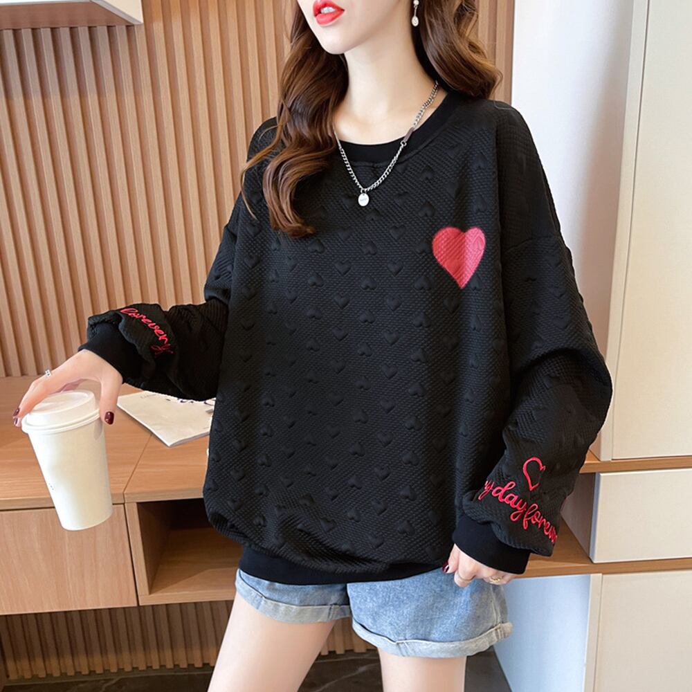 カジュアル ラウンドネック ロゴトレーナー エンボス加工 長袖プルオーバー ハート刺しゅう 体型カバー ロンT 春秋服
