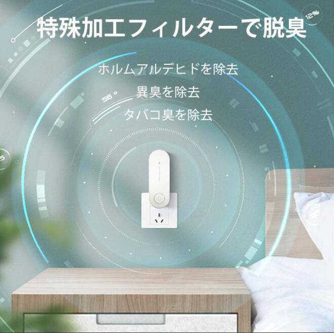 オゾンで脱臭+マイナスイオン機能搭載】オゾンは、悪臭のにおい分子を強力に酸化をして、においの無い物質に変化、分解させて、においを消します。ペット、トイレ、タバコ、ゴミなど様々なニオイを脱臭できます。ホルムアルデヒドの除去にも一定の効果があります。マイナスイオン発生器も搭載し、空気を洗浄します。【操作が簡単】オン/オフ用のボタンが1つ。ボタンを押すだけで新鮮な空気を楽しめます。【静音】作動時に音が静かで、ささやき声相当なレベルで、快適な高い静音性を実現します。空気清浄機のような不快な騒音がなく、寝るときに安心に使えます。【幅広く使える】トイレ、ペットルーム、ホテル、キッチンなどに適しています。LEDライプ搭載しているので、動作状態が一目でわかりやすい便利な設計です。【コンセント式オゾン脱臭機】このオゾン脱臭器はコンセントに直接差し込むので、場所を取りません。場所を取らず広範囲に消臭能力を発揮します。コンセントに差し込んだまま24時間作動OK、電池を別に購入することが不要です。