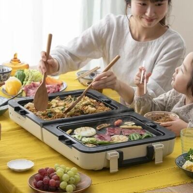 アルミプレートサイズがアップして、2種類の料理が一度にたくさんつくれる両面ホットプレートです。2枚のプレートで2種類の料理が同時にできます。プレートごとにそれぞれ温度調節ができるので、保温と高温調理など使い方に合わせて調理が可能です。付属の蓋を使用することで、蒸し料理や煮込み料理もできるので料理の幅が広がります。蓋の取っ手は折り畳んで収納できます。また、シリコン製で熱くならないので安心してご使用いただけます。折りたたみ式で折りたたむとサイズが1/2になり、キッチンのちょっとした隙間に収納が可能です。プレート及び蓋もホットプレート内に全て収めて収納できます。プレートは着脱可能なので丸洗いができ使用後のお手入れも簡単です。プレートは平面・焼肉・たこ焼き(25穴)プレートの3枚セットです。●電源:AC100V(50/60Hz共用)●消費電力:1300W●ヒーター:650W×2●温度設定:切・保温・約140〜約250℃●製品サイズ:使用時 W647×D363×H93?o/折りたたみ時 W167×D363×H340?o●コードの長さ:約1.8m●保証期間:お買い上げ日より1年間------------------以上が表データ--------------------●折りたたみ式でコンパクト収納●シリコン製の蓋付き、取っ手は折り畳んで収納●プレートは平面・焼肉・たこ焼き(25穴)の3枚セット●電源:AC100V(50/60Hz共用)●消費電力:1300W●ヒーター:650W×2●温度設定:切・保温・約140〜約250℃●製品サイズ:使用時 W647×D363×H93?o/折りたたみ時 W167×D363×H340?o●コードの長さ:約1.8m●保証期間:お買い上げ日より1年間------------------以上が表データ--------------------●折りたたみ式でコンパクト収納●シリコン製の蓋付き、取っ手は折り畳んで収納●プレートは平面・焼肉・たこ焼き(25穴)の3枚セット