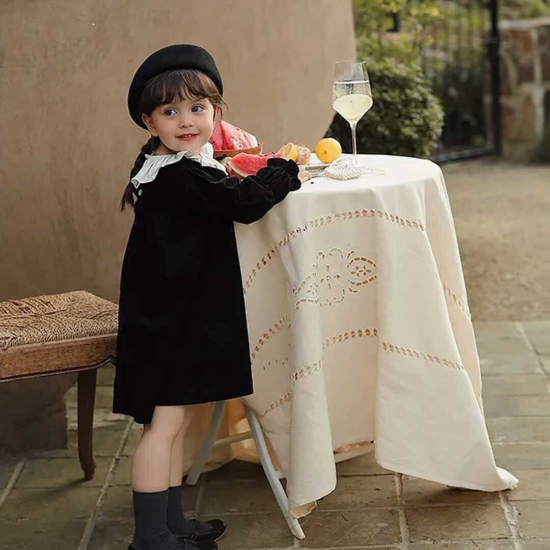 フォーマル 黒 ワンピース 女の子 襟 フリル ギャザースリーブ コードドレス レトロ 可愛い 無地 入学式